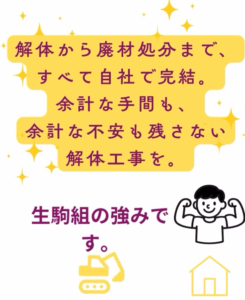 解体から廃材処分までワンストップ。 生駒組が選ばれる理由